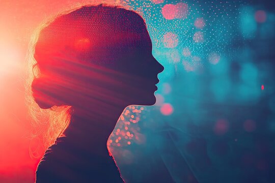 Professional woman reviewing documents and typing on laptop with ar hud data dashboard in office