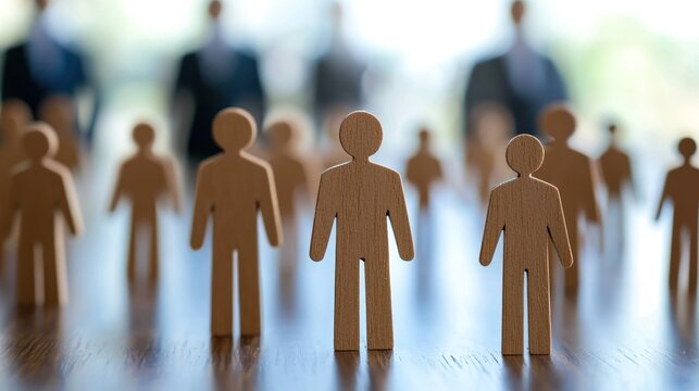 A magnifying glass focusing on a wooden figure of a person on a wooden surface with a blurred background.