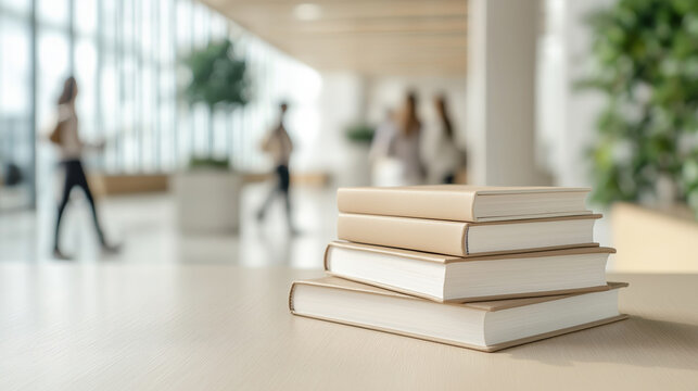 Books on wooden table and blurred library background, education and reading concept