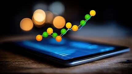 Digital tablet with rising graph and colorful data points on a blurred background, financial growth and analysis concept