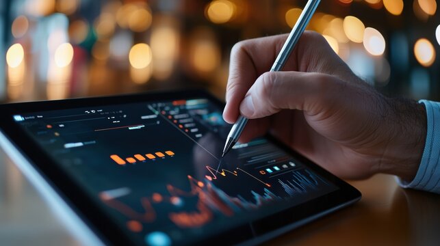Hand holding pen analyzing data on tablet screen with colorful graphs and charts in blurred background of warm lights and modern workspace ambiance