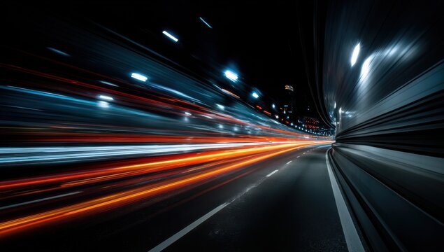 Highway at night, winding along coastal mountains. Light trails from cars blur across the road, reflecting the movement and energy of travel.  The dark silhouette of mountains meets the dark water