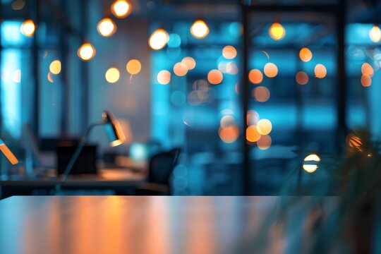 At night beautiful Abstract blurred office interior room blurry working space with defocused effect : Generative AI