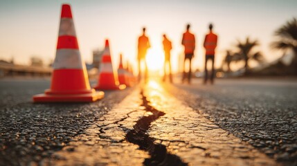 Semi truck with trailer drives on empty road near industrial warehouses at sunset, with blurry motion.