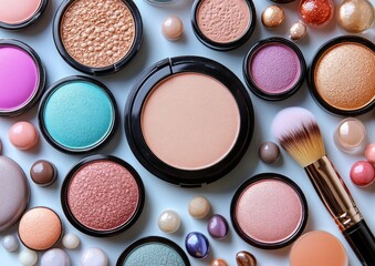 Various makeup products including blush and eyeshadow are artfully displayed on a table