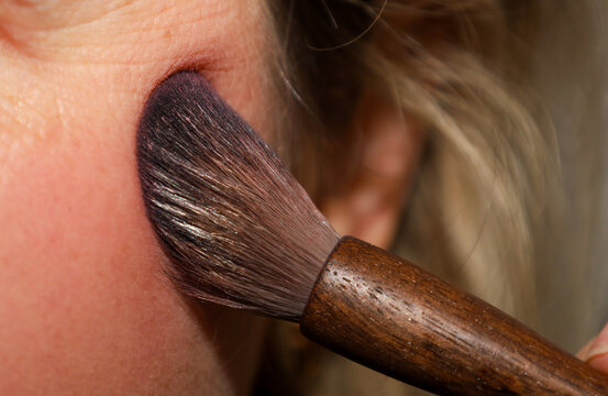 A soft cosmetic brush with natural bristles smoothly applies dry blush or powder to a woman's cheek. The makeup process highlights skin texture and helps contour the face for a fresh, radiant look.