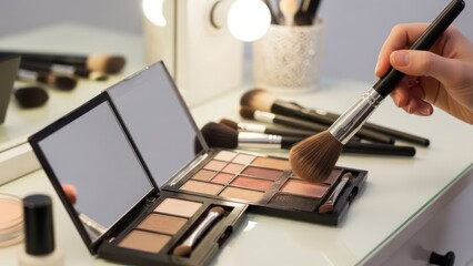 Hand holding brush over a palette on a vanity table with lights