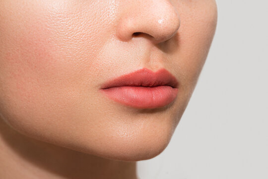 A young caucasian woman is seen closeup and from the side, pointing towards her red flushing cheek with blotches and dilated blood vessels, al symptomatic of rosacea