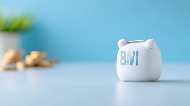 A small, white piggy bank with the letters BNI sits on a light blue surface, with a plant and coins blurred in the background, symbolizing savings and finance.