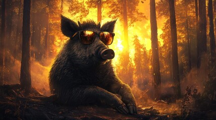 A wild boar wearing sunglasses sits calmly in a burning forest at sunset.