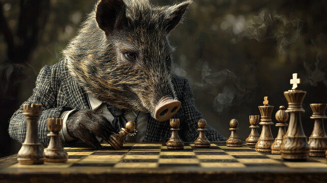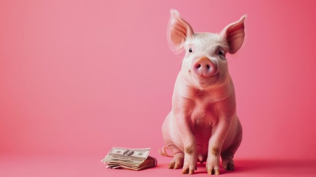 A gentle piglet looks at the camera, surrounded by a farm scene