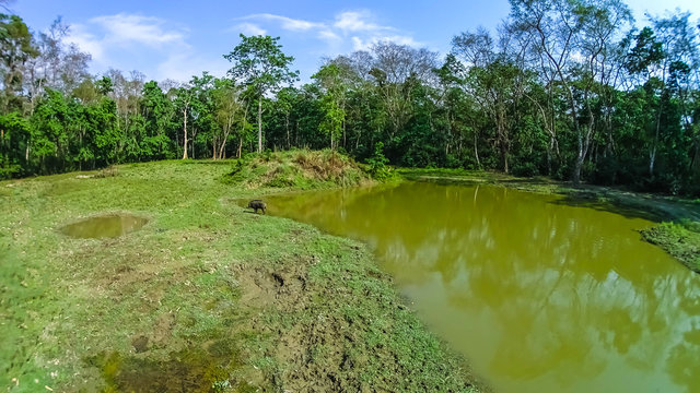 A young wild boar piglet grazing on a bed of fresh green leaves in a lush, green outdoor setting.