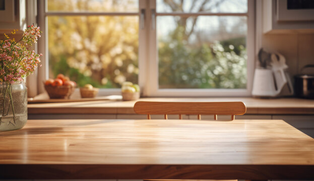 Rustic charm. Vintage kitchen interior setting. Modern and bright. Empty space with rustic oak wooden table. Retro ambiance