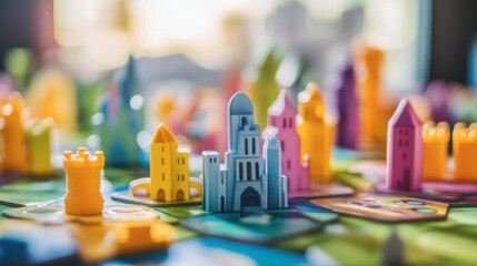 Colorful miniature castles and buildings on a vibrant board game, creating an engaging play environment