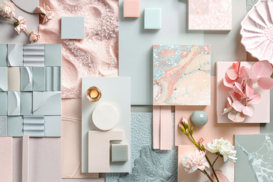A variety of pink and blue material items, including various type of ceramic tile, feminine and elegance mood board for interior design.