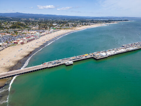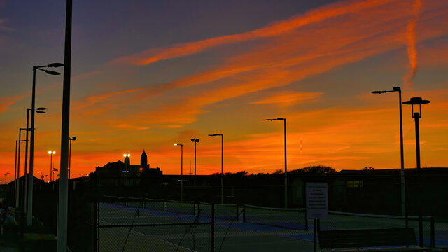 Red Sunset Over the Boardwalk. High quality photo. Red Clouds and lamp Posts line the Board Walk