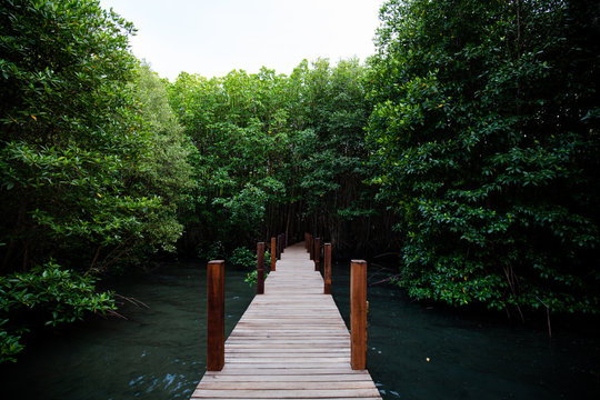 A wooden boardwalk winding through a wetland preserve, with educational signage and lookout points