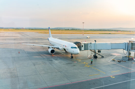 .The gate sleeve is docked to the aircraft.