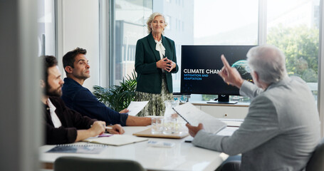 Climate change, meeting and question with business people in office boardroom for going green initiative. Computer screen, proposal and presentation with corporate team at work for sustainability