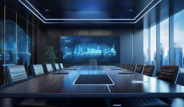 A high-tech, futuristic corporate boardroom with a large digital screen displaying data analytics and futuristic city visuals. The sleek, modern conference room features ambient blue lighting, a long