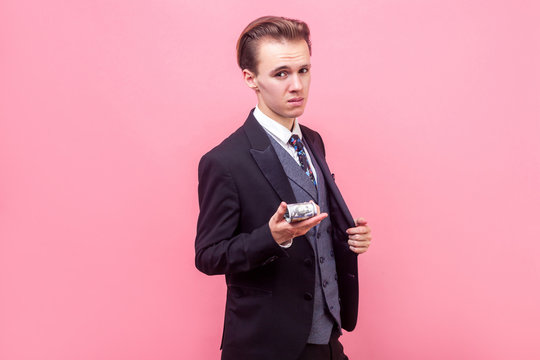 Portrait of arrogant rich businessman in elegant suit and with stylish haircut showing bunch of dollars on camera, offering money or boasting earnings. indoor studio shot isolated, pink background