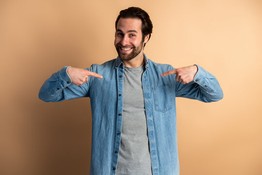 Bossy man in denim shirt pointing at himself and looking with wide smile, demonstrating authority