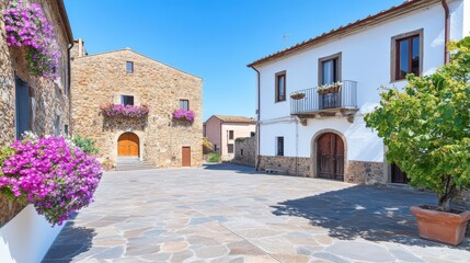 Historical Architecture in Sunlight:  A picturesque Italian village square, where the buildings boast both intricate stonework and classic white walls, stands resplendent under the sun.
