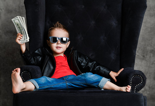 Impudent kid boy millionaire in leather jacket and red t-shirt is sitting lounging in armchair holding a bundle of cash