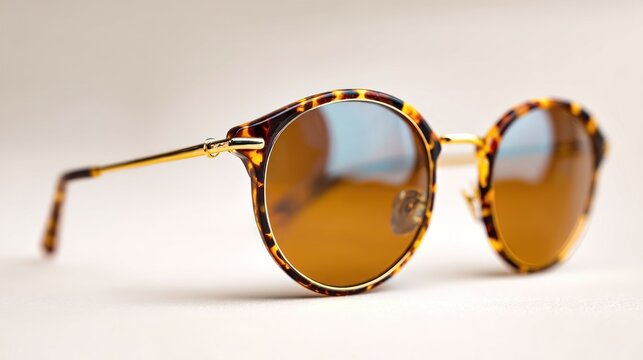 Round-framed eyewear rests on a plain surface. The frames boast tortoise-shell patterns, complemented by gold-toned temples and tinted lenses