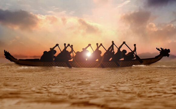 Group of people paddling dragon boat at sunset