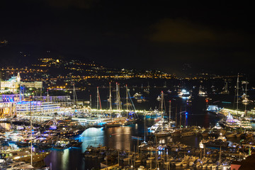 World Fair MYS Monaco Yacht Show at night, Port Hercules, luxury megayachts, many shuttles, party time, boat traffic, long exposure, aerial view, cityscape, night lights, illumination of boat