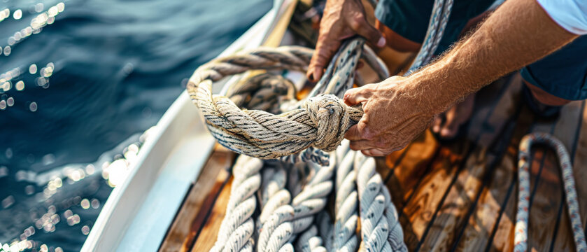 Hands coiling a rope on a sailboat deck, capturing the essence of seafaring.