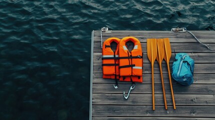 Neatly arranged boating equipment on a dock, emphasizing safety and leisure. Ideal for boating and outdoor content.
