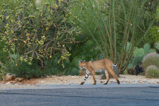 A wild bobcat walking on brown dirt ground past a broad tree trunk with dry grasses in the background. A right rear three quarter view. Beautiful feline wildlife headed out for a morning hunt. Arizona