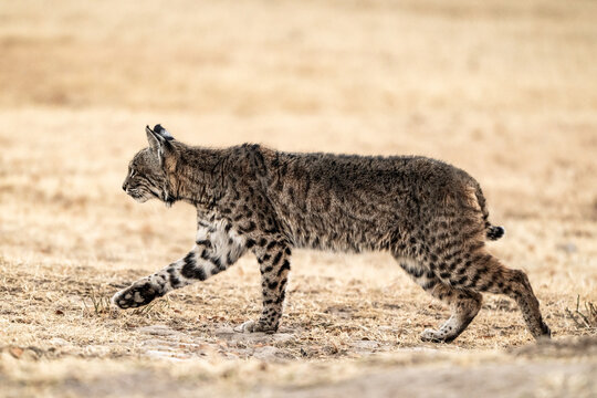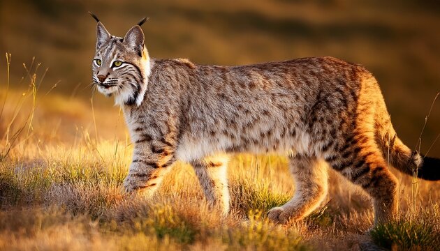 vivid, bright image of majestic bobcat walking on tree branch. Bright and colorful photo.