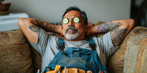 Confident tattooed man showcasing body art in studio