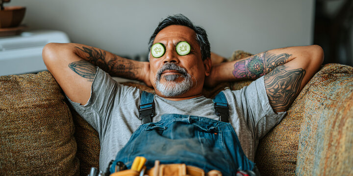 A tattooed man lathering his face with shaving cream, intensely focused on grooming himself in a sleek and contemporary bathroom setting; a moment of self-care.