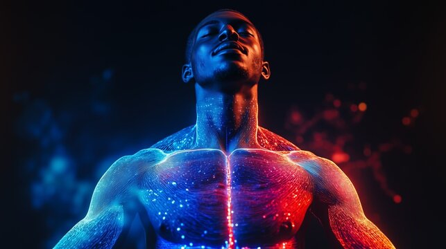 3D body scan of an athlete showing muscles and nutrient absorption pathways, illustrating the science of fitness and nutrition
