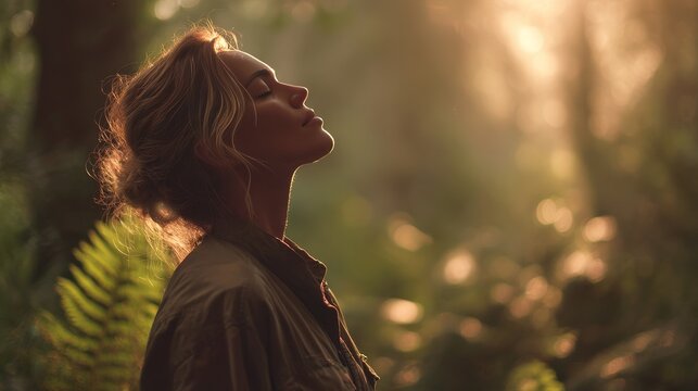 Woman Breathing Deeply in Nature with Eyes Closed Enjoying Sunlight