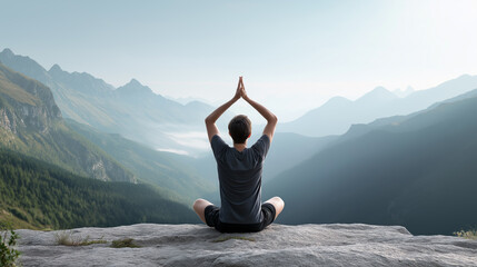 Person practicing yoga meditation on mountain cliff overlooking peaceful valley landscape.