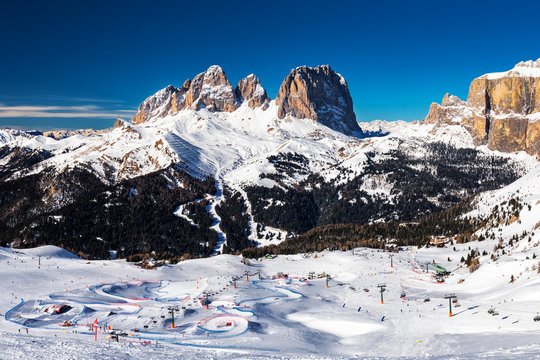 Dolomity superski mountain resort with torri del sella, piz boe and sella ronda, Canazei, Italy, Europe