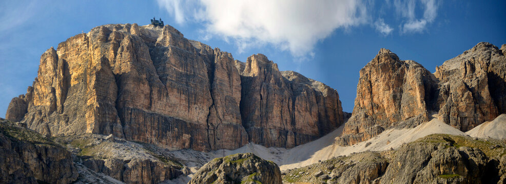 Summer view of Sella Towers and Piz Boè from Passo Pordoi, Canazei, Dolomites, Italy