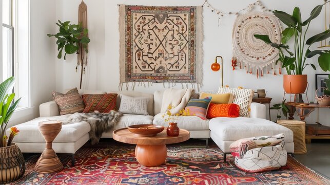 A bohemian living room with vibrant textiles, lush plants, and soft silhouettes for a cozy ambiance.