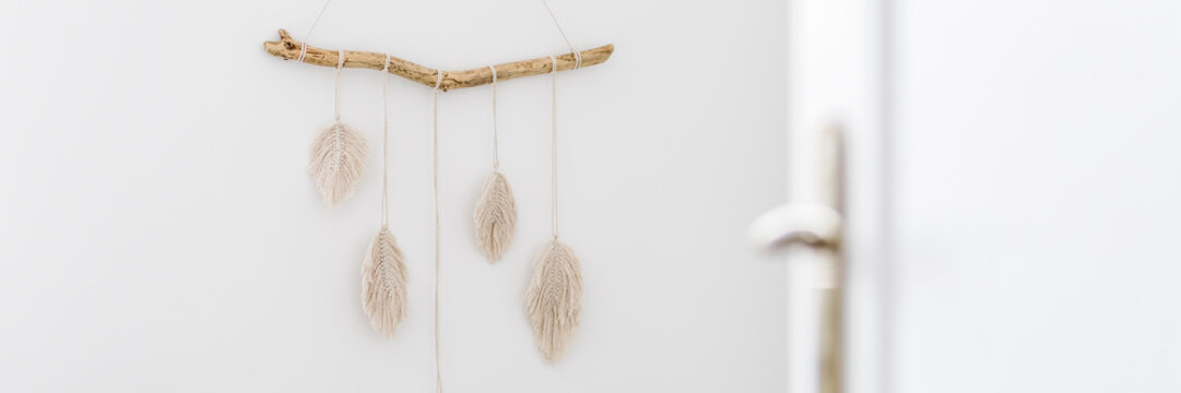 Christmas boho decorations. Beautiful christmas tree and boho decor background. New Year composition. Holiday card copy space