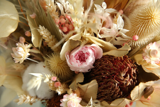 Beautiful floral arrangement of mostly Australian native flowers in a pink vase, including protea, banksia, eucalyptus leaves and wax flowers, on a white table with a white background.