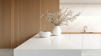 Home backdrop presentation on white wooden surface for a clean and modern boho farm house look. Background for product display, selective focus. ai generated.