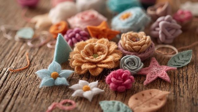 Handmade felt flowers and rosettes arranged on rustic wooden workbench for crafting
