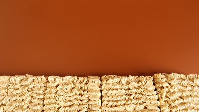 Instant noodles asian ramen. Dry yellow raw food noodles. pasta, for the preparation of which it is enough to pour boiling water and wait a few minutes. Copy space korean and japanese vermicelli