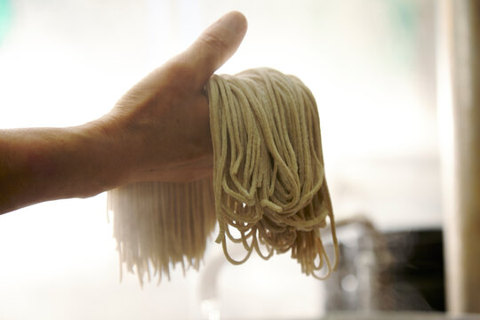 Asian woman seasoning ramen with wooden bowl at home kitchen
