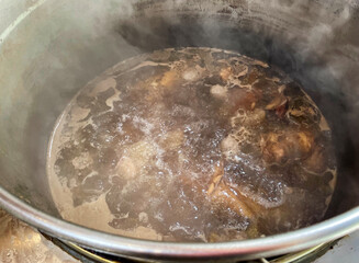 Vibrant stovetop stew pot with eggs and star anise in rustic setting